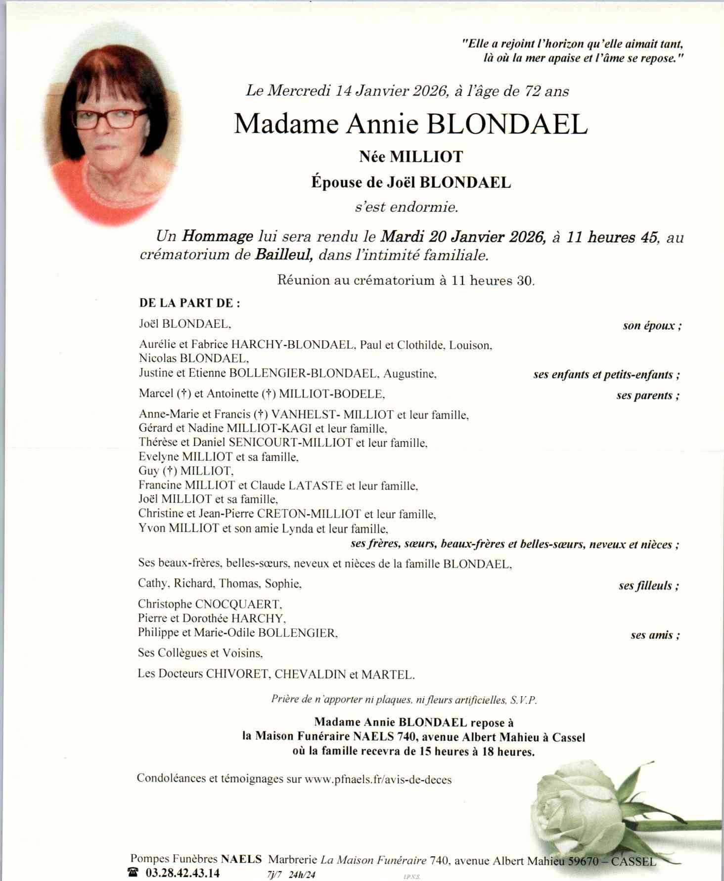 C’est avec une grande tristesse que nous vous annonçons le décès d’Annie BLONDAEL survenu le mercredi 14 janvier 2026 à Divion.