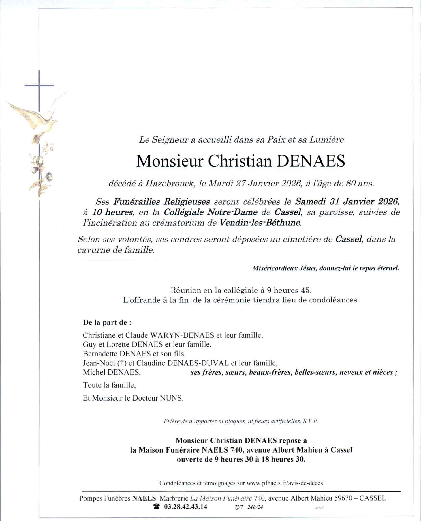 C’est avec une grande tristesse que nous vous annonçons le décès de Christian DENAES survenu le mardi 27 janvier 2026 à Hazebrouck. La cérémonie se déroulera le samedi 31 janvier 2026 à 10h00 à l’adresse suivante : Église Notre Dame - 59670 Cassel.