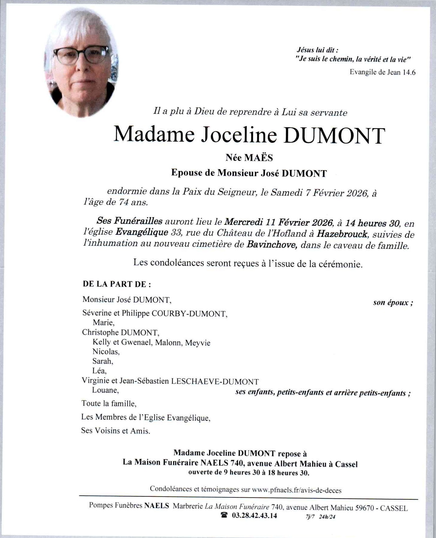 C’est avec une grande tristesse que nous vous annonçons le décès de Joceline DUMONT survenu le samedi 07 février 2026 à Hazebrouck. La cérémonie se déroulera le mercredi 11 février 2026 à 14h30 à l’adresse suivante : Eglise Evangélique - 59190 Hazebrouck.