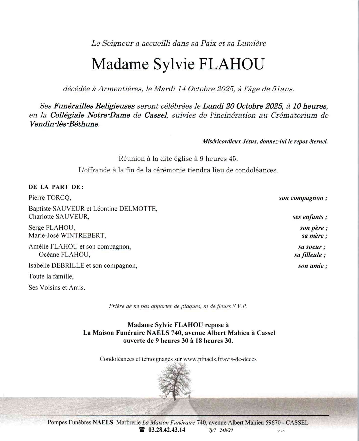 C’est avec une grande tristesse que nous vous annonçons le décès de Sylvie FLAHOU survenu le mardi 14 octobre 2025 à Armentières. La cérémonie se déroulera le lundi 20 octobre 2025 à 10h00 à l’adresse suivante : Église Notre Dame - 59670 Cassel.