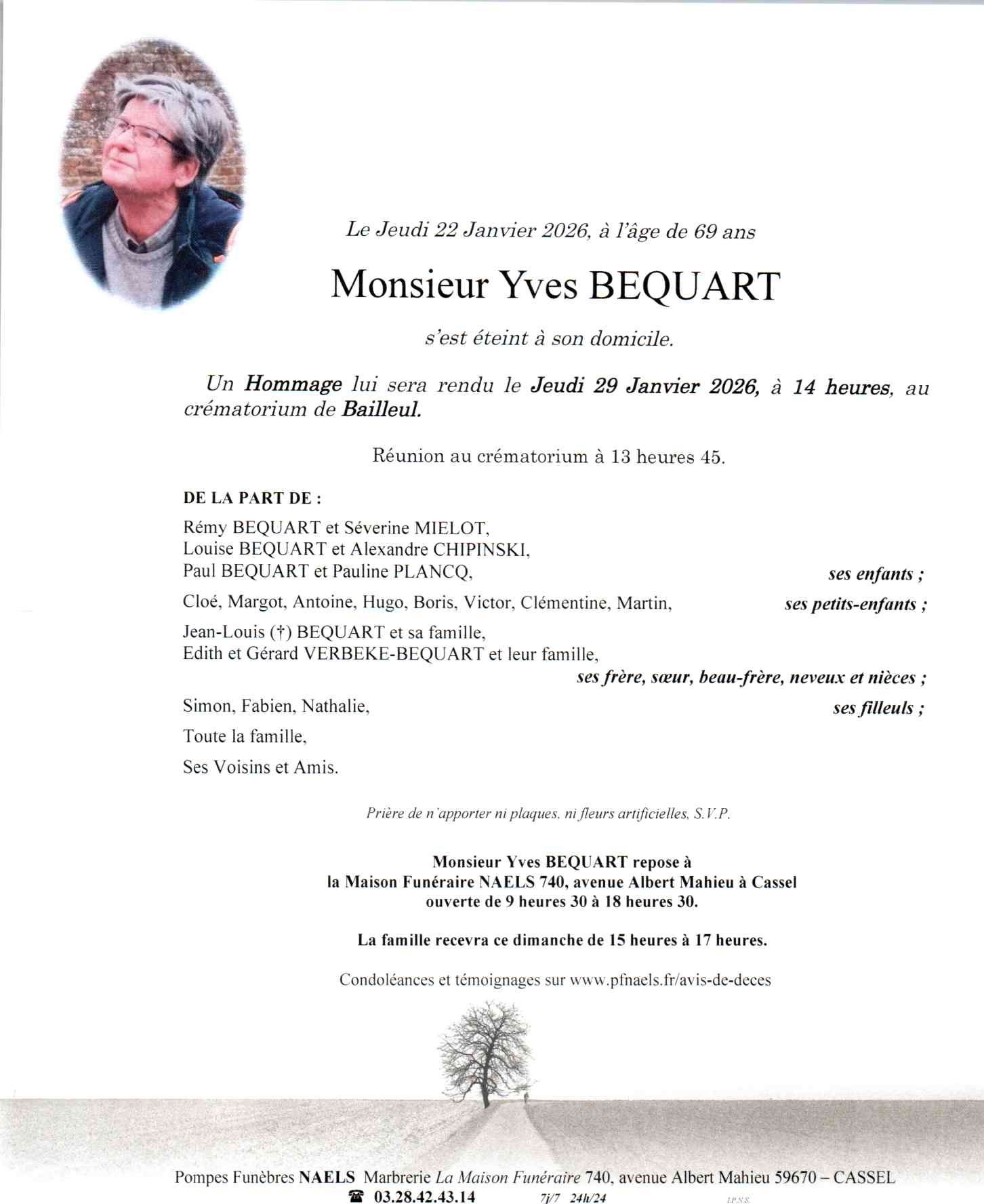 C’est avec une grande tristesse que nous vous annonçons le décès d’Yves BEQUART survenu le jeudi 22 janvier 2026 à Cassel.